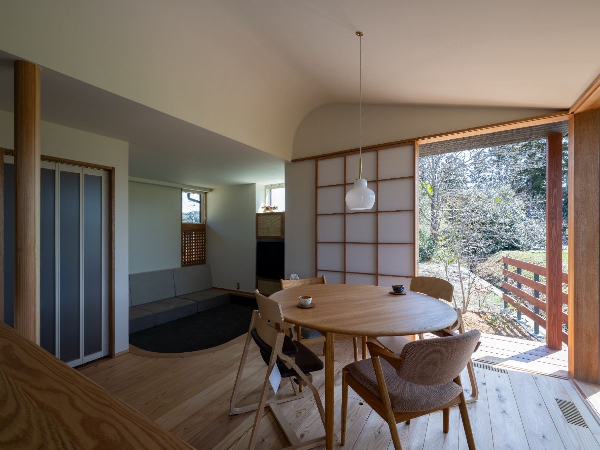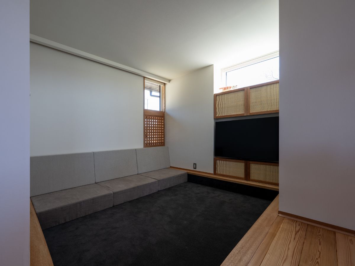 小上がりの畳・小下がりのカーペット・ダイニングなど、様々な居場所が点在し、付かず離れず、ひとつ屋根の家を実現しました。